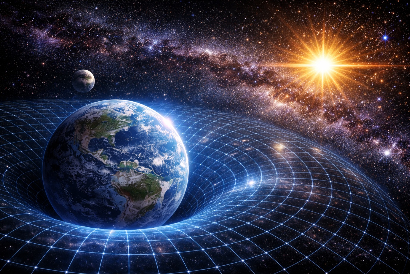 아인슈타인의 상대성이론에 따르면 중력은 단순한 힘이 아니라 시공간의 휘어짐입니다. 질량이 큰 물체는 주변 공간을 휘게 만들고, 그 결과 다른 물체가 그 영향을 받아 움직이게 됩니다.