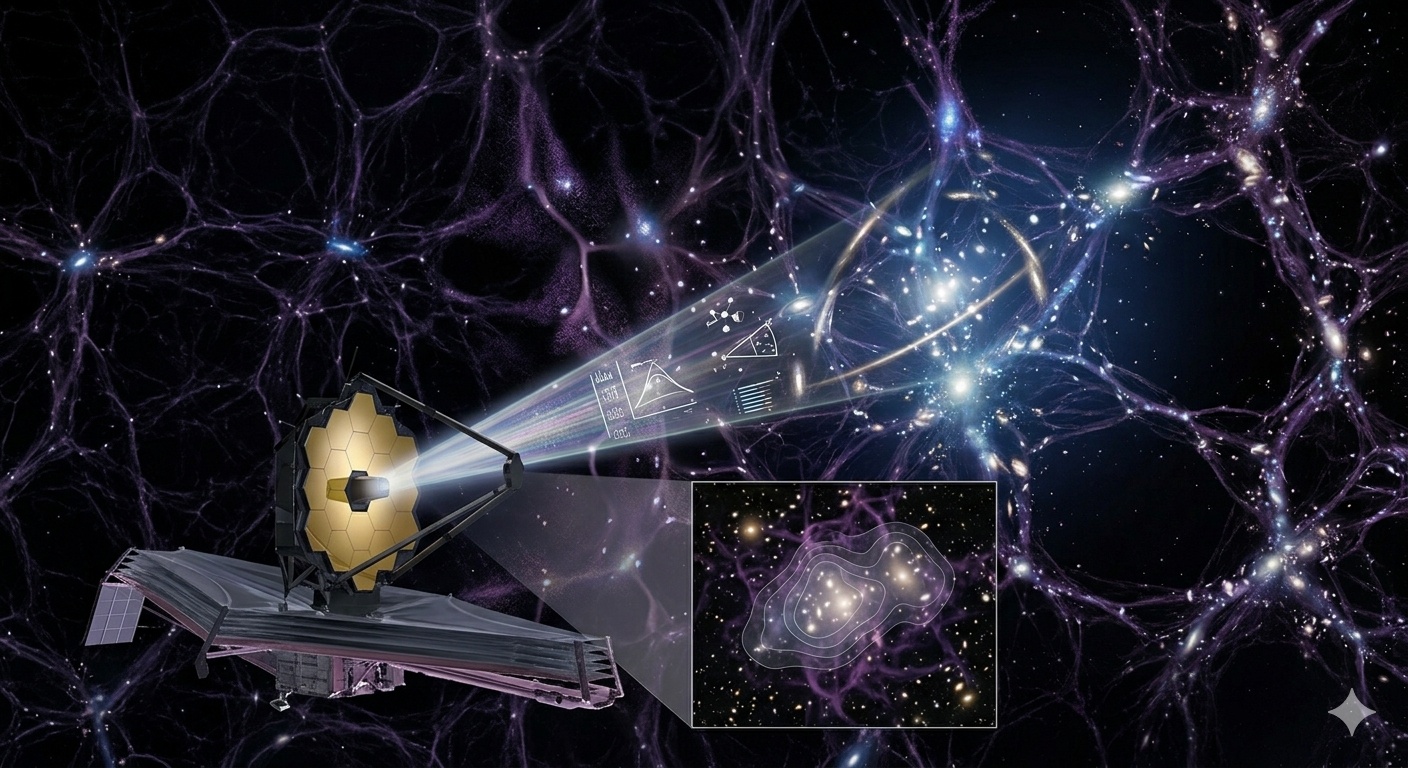 멀리 있는 천체의 빛이 중간에 있는 질량에 의해 휘어질 때, 그 휘어짐의 정도를 분석하면 해당 영역의 전체 질량을 추정할 수 있습니다.