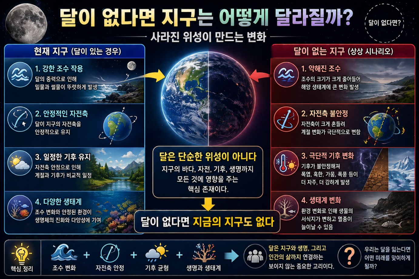 ✔️ 한 줄 정리: 달은 없어도 되는 존재가 아니라, 지구를 지탱하는 중요한 요소다.